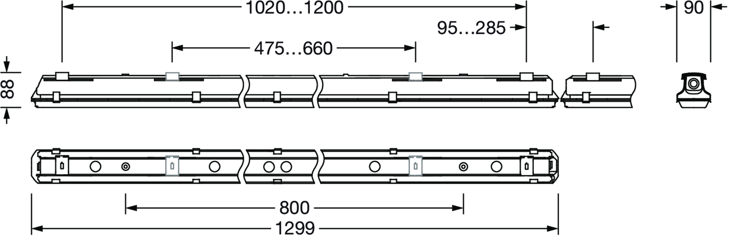 Monsun 21, Feuchtraumleuchte, Kettenabhänger, primäre lichttechn. Abdeckung: Abdeckwanne, aus PC, Lichtaustritt: direkt strahlend, primäre Lichtcharakteristik: symmetrisch, Montageart: abgehängte Montage, Anbau, horizontale Montage, vertikale Montage, LED, Bemessungslichtstrom: 2.620lm, Lichtausbeute: 153lm/W, Lichtfarbe: 840, Farbtemperatur: 4000K, Vorschaltgerät: EIN/AUS, mit Klemme, 3polig, max. 2,5mm², Netzanschluss: 220..240V, AC, 50/60Hz, Bemessungsleistung: 17,1W, Gehäuse, aus Polyester, glasfaserverstärkt, unbehandelt, hellgrau, inkl. Kettenabhänger, robuste Gehäuseausführungen für den Einsatz im Innen- und im Semi-Außenbereich, Länge: 1.299mm, Breite: 90mm, Höhe: 88mm, Abdeckwannen-Verschluss, aus Edelstahl (V2A), Deckenmontage-Element, aus Edelstahl (V2A), Kettenabhänger, aus Edelstahl (V2A), Schutzart (gesamt): IP66, Schutzklasse (gesamt): SK I (Schutzerdung), Prüfzeichen: CE, ENEC, VDE, UKCA, Schutzzeichen: D, Schlagfestigkeit: IK08, zul. Betriebsumgebungstemperatur: -25..+50°C, Norm: EN 50419, EN 60598-2-1, entspricht den Anforderungen von IFS (International Featured Standards) für Sicherheit und Qualität in der Lebensmittelindustrie, für Innen- oder überdachte Außenmontage, keine direkte Beschneiung, keine direkte Sonnenbestrahlung, kein direkter Regen, LABS-Konformität geprüft gemäß VDMA 24364:2018-05, Kontaktieren Sie ihren Verkaufsberater, bevor Sie die Leuchten in Anwendungen mit unklarer chemischer Belastung, großen Temperaturschwankungen oder kondensatbildender Luftfeuchtigkeit einsetzen, Verpackungseinheit: 1 Stück
