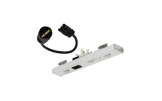 Modario, Schieneneinsatz, Steckdose,mit Stecker, 3polig, mit Phasenwahl, Netzanschluss: 240V, AC, 50Hz, Steckdosen-Einsatz, aus Stahlblech, bandlackiert, leuchtenweiß, 1x Systemmaß, werkzeuglose Schnellmontage der Leuchteneinsätze an der Tragschiene mit Hilfe von Kunststoff-Metall-Drehriegelverschlüssen; damit verbunden eine erhöhte Sicherheit im Brandfall, Länge: 299mm, Breite: 48mm, Schutzart (gesamt): für Schutzart IP20, Schutzklasse (gesamt): SK I (Schutzerdung), Prüfzeichen: CE, Verpackungseinheit: 1 Stück