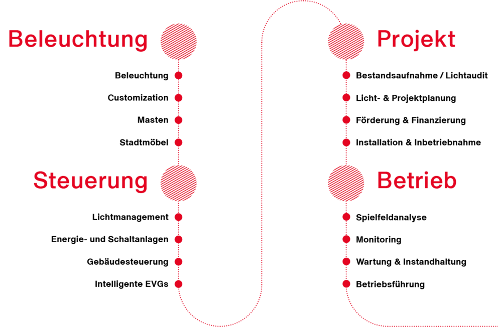 Ganzheitliche Lösungen von der Beleuchtung über die Steuerung bis zur Umsetzung des Projektes und dem Betrieb.
