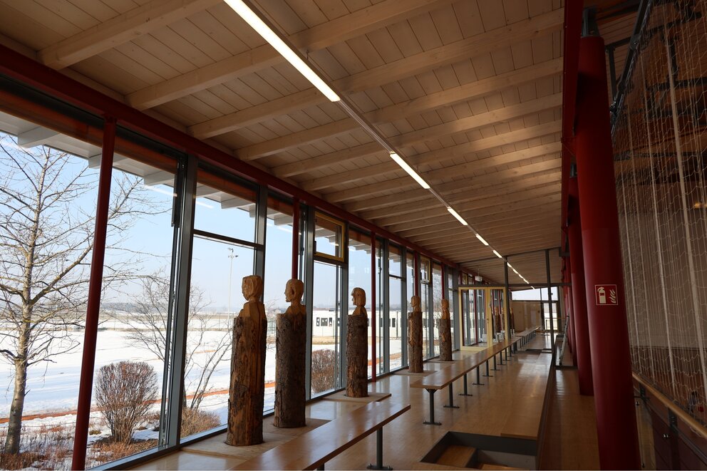 Licross 11 schafft auf der Tribüne angenehmes Licht für Komfort und Orientierung – so genießen Zuschauer das Spielgeschehen ohne Ablenkung. In den Nebenbereichen setzen Lunis 21 Downlights und Round 31 Wand- und Deckenleuchten gezielte Akzente.