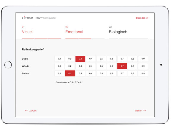 Für eine wirksame HCL-Lösung müssen Planung, Konfiguration, Installation und Kalibrierung perfekt auf individuelle Gegebenheiten abgestimmt sein. Im HCLlive Konfigurator stellen wir die entscheidenden Fragen, um die perfekte HCLlive-Lösung für Ihr individuelles Projekt herauszufinden. Damit erhalten wir Details zur baulichen Umsetzung und sie Ihre individuelle HCL-Lichtverlaufskurve, die wir mit unseren SITECO Connect Steuerungslösungen implementieren. Das Ergebnis: passgenaue Parameter zur optimierten Ansteuerung von Farbtemperatur, Beleuchtungsstärke und Lichtdynamik.