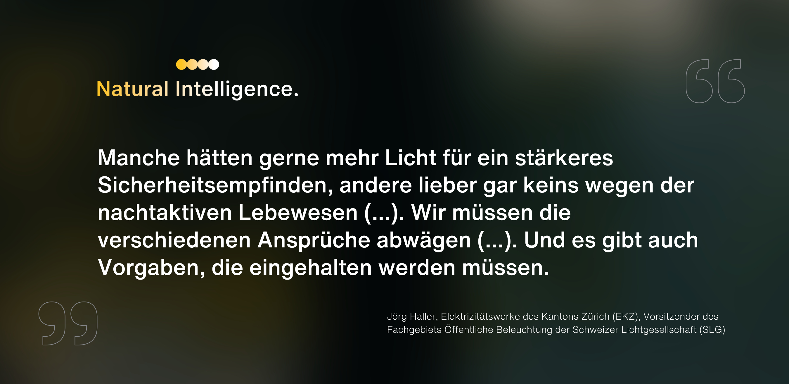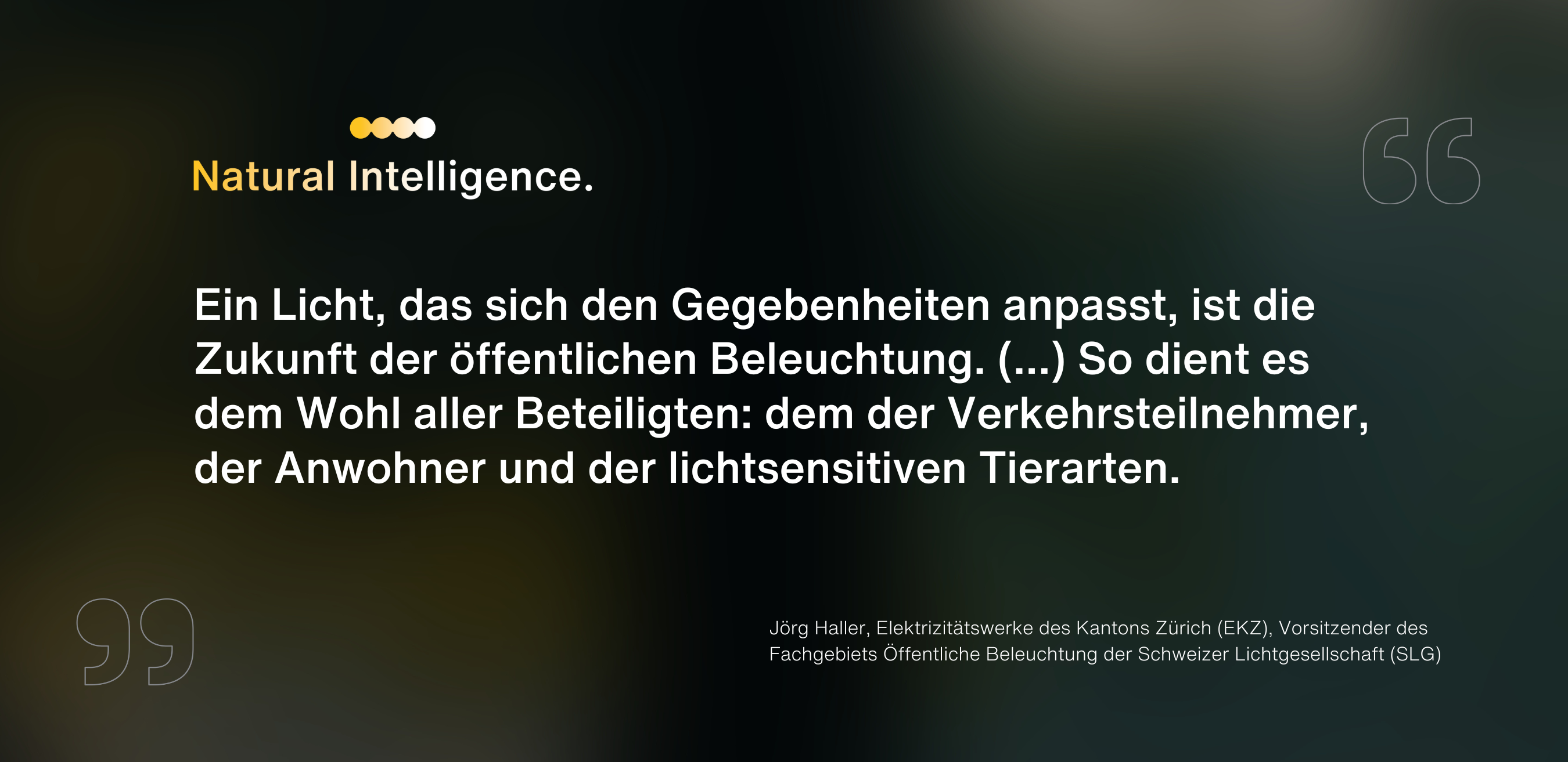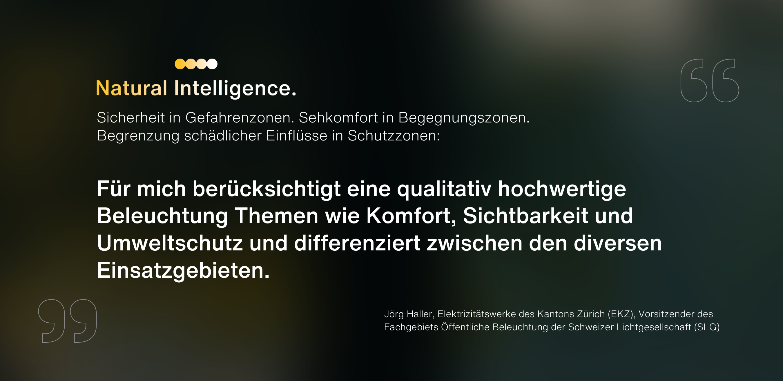 Gemeinsam finden wir die ideale Beleuchtungslösung für Ihre spezifische Situation – je nach Anwendung sowie Tages- und Jahreszeit. Je nach öffentlichen Anforderung und natürlichen Rahmenbedingungen. Zum Schutz von Mensch, Natur und Umwelt. Unter Berücksichtigung aller relevanten Aspekte.