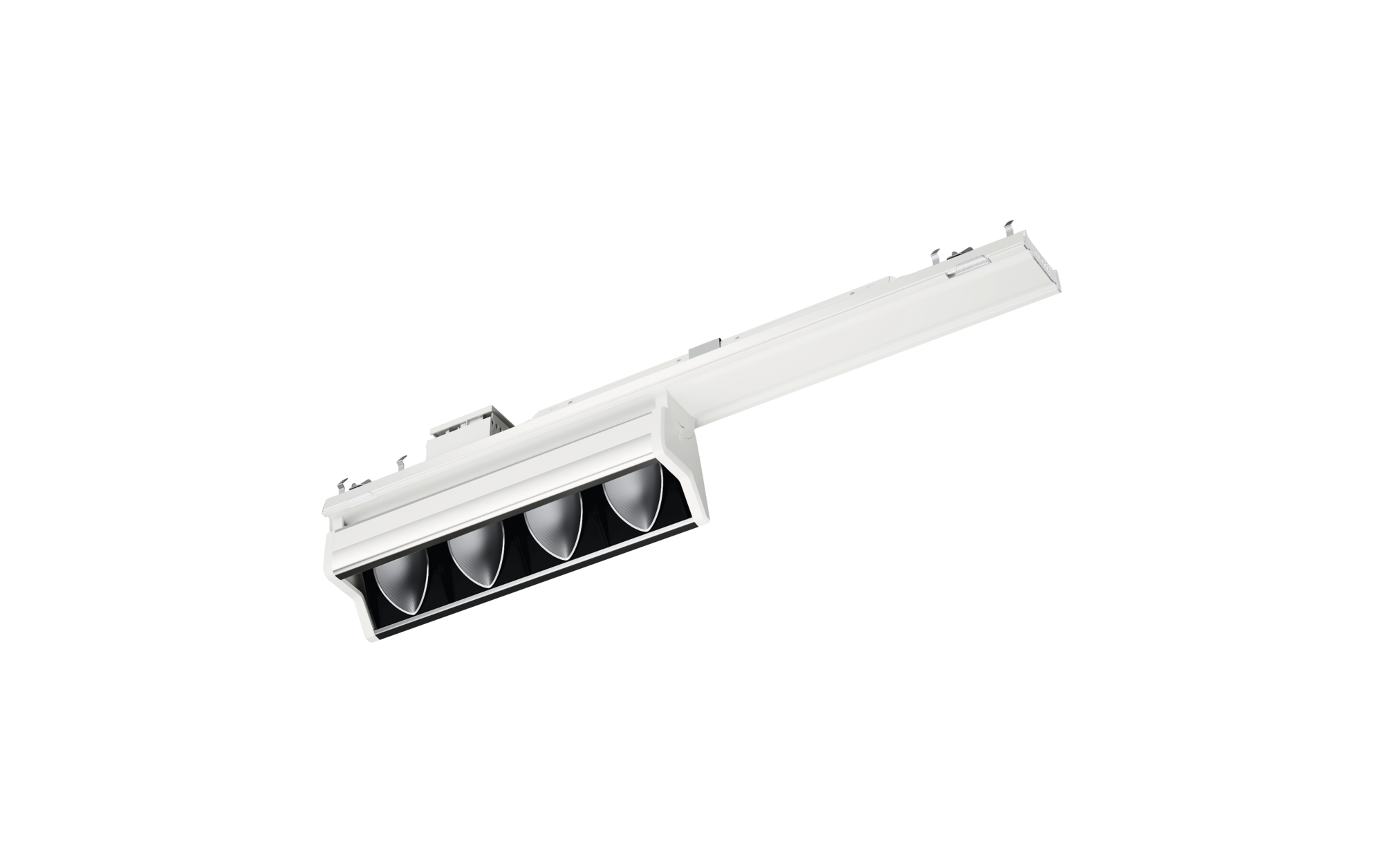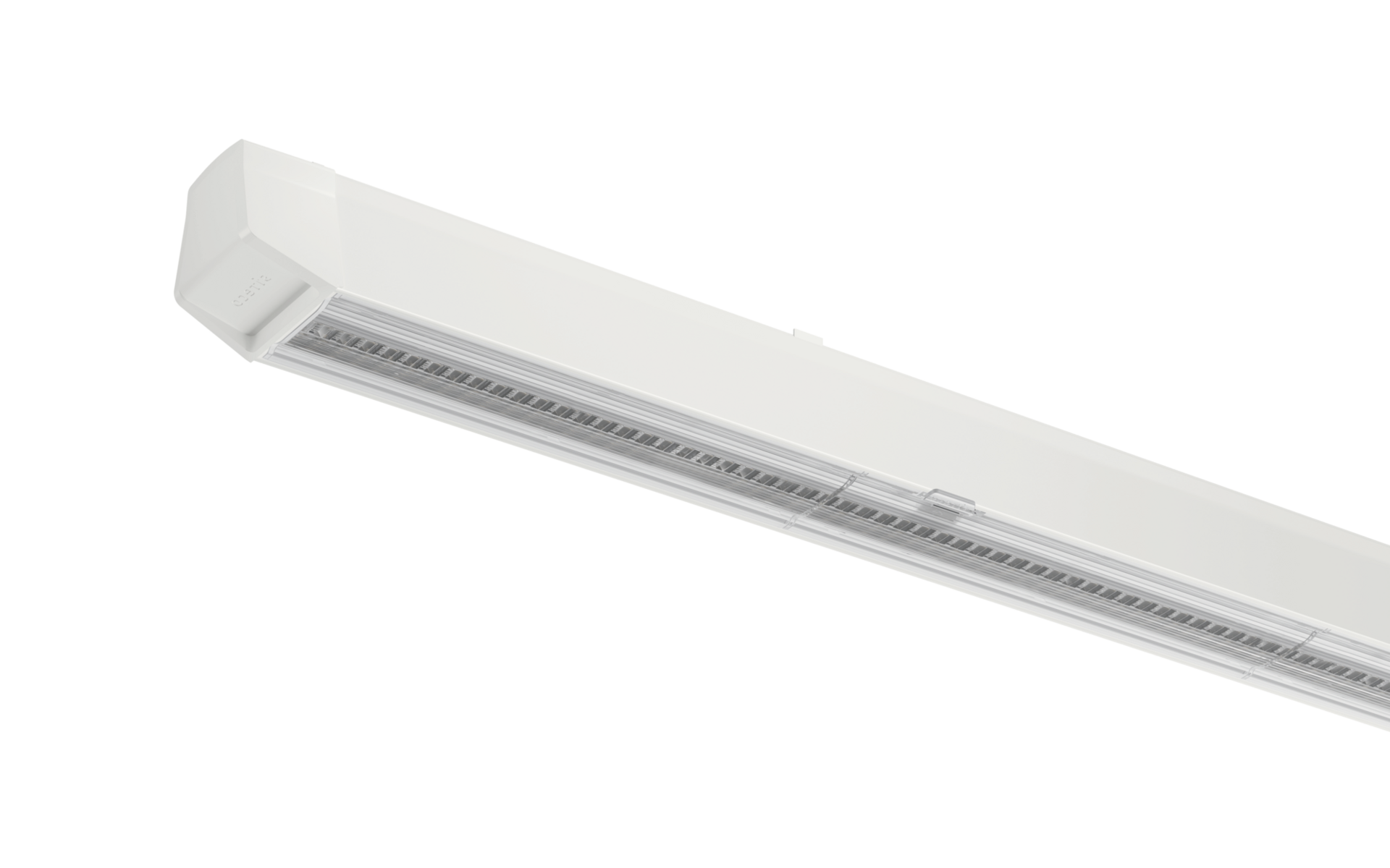 Mit vier Einzelreflektoren asymmetrisch breit strahlend für gleichmäßige Lichtverteilung über die gesamte Regalhöhe mit reduzierter Leuchtdichte im oberen Bereich