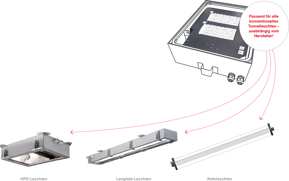 Wir wissen: Jeder Tunnel ist anders. Aber unsere LED-Sanierungs-Einsätze sind immer passgenau. Und dank Klebetechnik gelingt die Sanierung unkompliziert – und in Bestzeit. Auf Anfrage sind auch individualisierte Anbindungen möglich – für eine passgenaue Sanierungslösung.