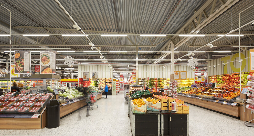 Wer Kunden glücklich machen will, muss Einkaufen zum Erlebnis machen. Lichtlösungen von SITECO unterstützen diesen Ansatz und verbessern gleichzeitig die Energiebilanz – wie im ICA Maxi Markt Flygstaden in Halmstad/Schweden. Hier hat das Licross® Lichtbandsystem die alte Beleuchtung mit T5-Leuchtstofflampen abgelöst. Diese hatten es nur auf ein mittelmäßiges Lichtlevel gebracht und waren einfach in Reihen montiert – unflexibel und völlig losgelöst vom Marktlayout. Dank SITECO ist es im Markt jetzt deutlich heller. Optionales Dimmen spart nicht nur Energie, sondern bietet auch die Möglichkeit, einzelne Flächen und Bereiche bewusst zu inszenieren. Die gut ausgeleuchteten Gänge helfen bei der Orientierung im Markt, die freundliche Atmosphäre lädt zum Verweilen ein. Satte Farben bei Obst und Gemüse machen Appetit.