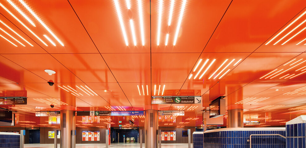 Übersichtlich und hell - so präsentiert sich das umgebaute Zwischengeschoss der Münchner U- und S-Bahnstation Marienplatz, mit bis zu 200.000 Fahrgästen pro Tag einer der wichtigsten Knotenpunkte in Münchens öffentlichem Nahverkehr. Zentrales Design-Element ist die orangerote, leicht reflektierende Decke. In ihr wurden mehr als 1.000 speziell entwickelte LED-Lichtlinien von SITECO integriert sowie Wallwasher zur Beleuchtung der Beschilderung.