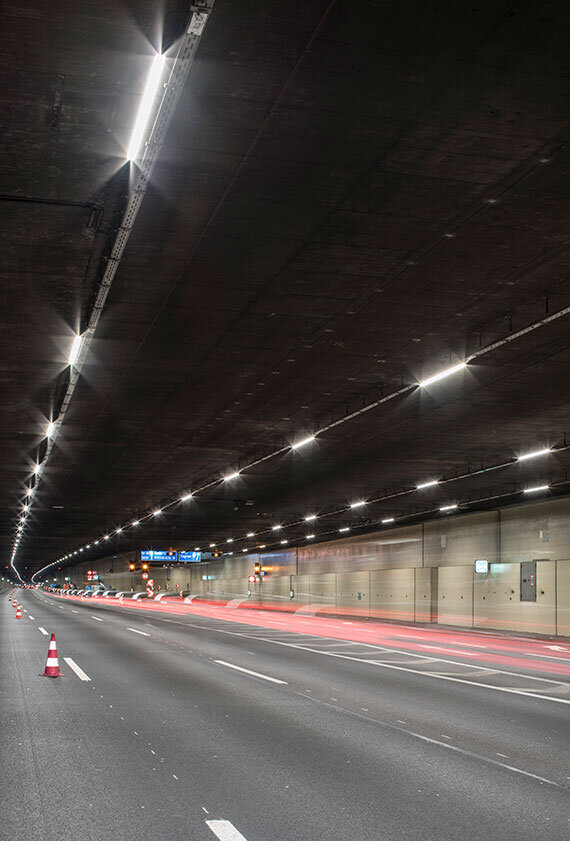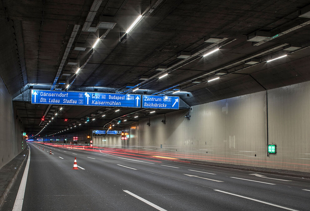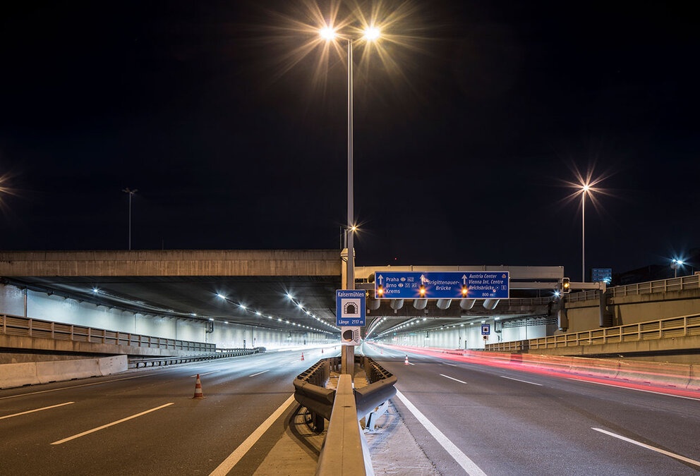 Der Kaisermühlentunnel in Wien ist der meist befahrene Tunnel in Österreich – und jetzt auch der sicherste. Dafür sorgen Videokameras, Mikrofone, das Alarmsystem AKUT und rund 1.600 SITECO-Tunnelleuchten. Beste Sicht und bester Sehkomfort. Die neue Beleuchtung unterstützt auch das Anpassen des Auges an die Sichtverhältnisse im Tunnel durch kraftvolle Tunneleinfahrtsbeleuchtung. Leuchtdichtekameras messen die Helligkeit vor dem Tunnel und regulieren in Echtzeit die Beleuchtungsstärke im Tunnelinneren.