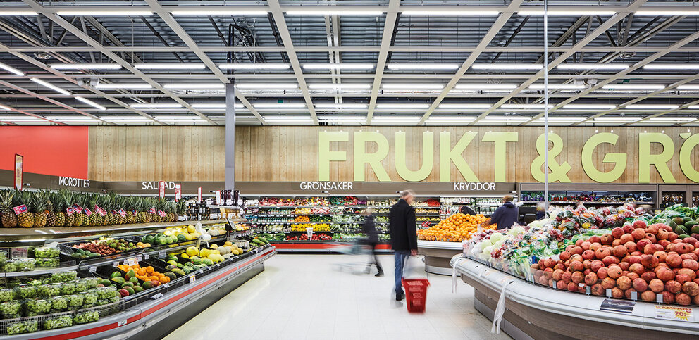 Das stationäre Geschäft muss sich neu inszenieren, um zu einem Ort zum Verweilen zu werden. Unterschiedliche Lichtszenarien für Obstregale, Frischetheken und andere Filialbereiche schaffen die passende Atmosphäre, um das Vertrauen in die Produkte zu steigern. Der ICA Maxi Markt in Jönköping, Schweden hat durch die Sanierung der Beleuchtungsanlage mit dem SITECO Modario®-Lichtbandsystem Verkaufsflächen neu inszeniert und gleichzeitig deutlich Energie- und Wartungskosten reduziert.