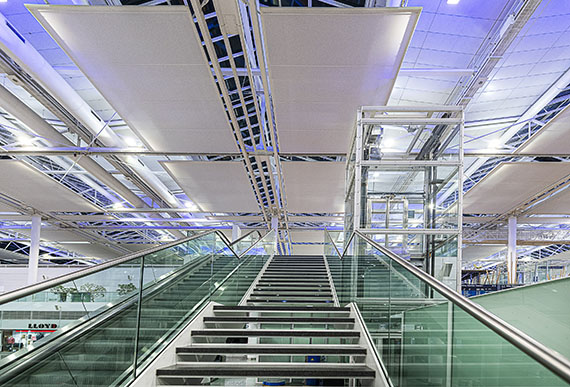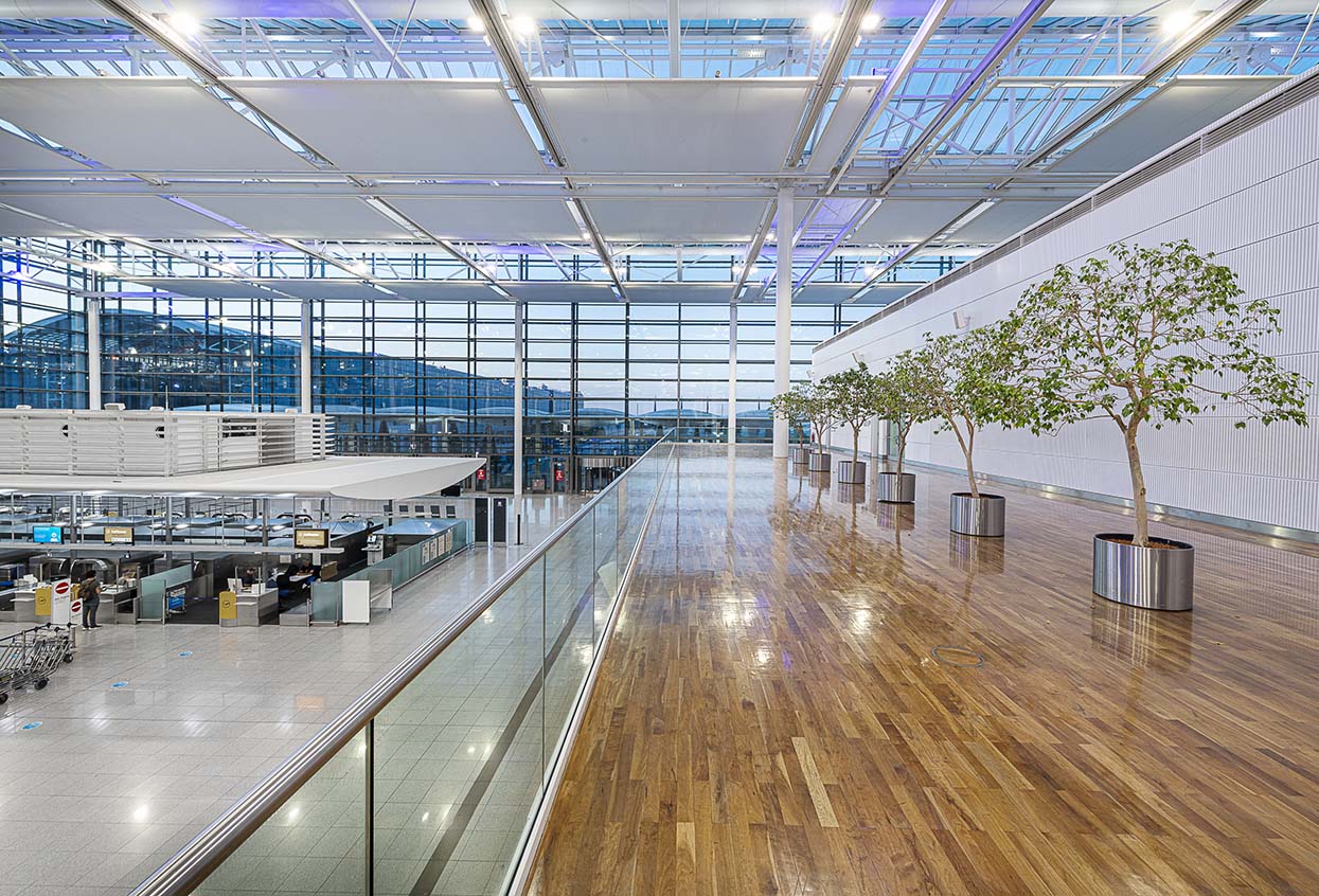 damit enorme Mengen CO2 eingespart. Wie auch beim Neubau 2003 war SITECO erste Wahl, denn die Zuverlässigkeit und Lichtqualität sprachen für sich. Neben dem Ziel deutlich Energie zu sparen, überzeugt die Lichtlösung durch ihre einzigartige Lichtwirkung und integriert sich harmonisch in das architektonische Ensemble. Das Besondere: das von Ulrike Brandi entwickelte Lichtkonzept wird fortgeführt und die Terminaldecke erstrahlt dank der Kombination der beiden eingesetzten Lichtfarben Deep Blue und neutralweiß im Floodlight FL 20 im Weiß-Blau des bayerischen Himmels.