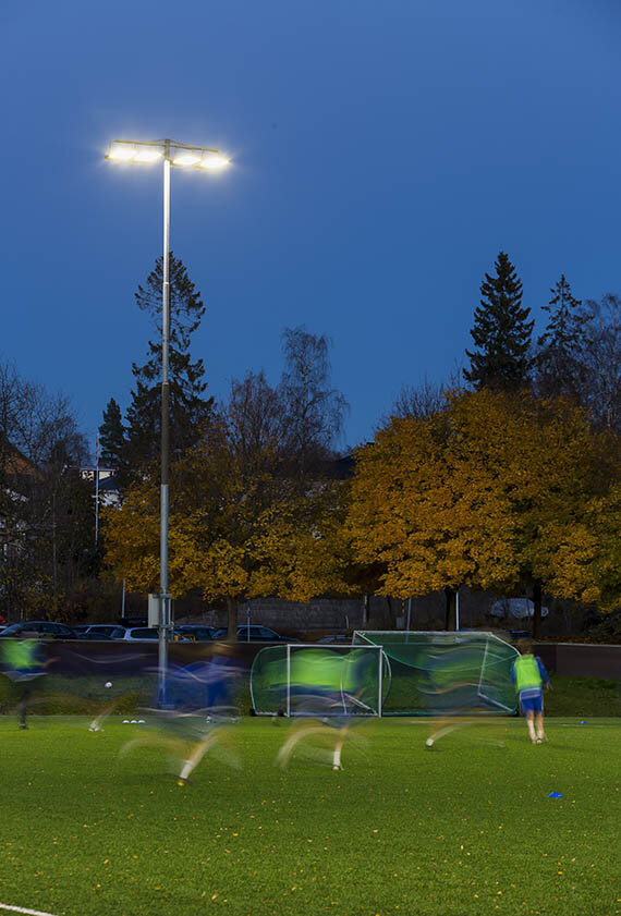 Die neue Lösung kombiniert nun die vorhandenen Masten mit hochmodernen SITECO-Leuchten plus Steuerung von DATEK. Das Ergebnis: professionelles Licht mit hohem Sehkomfort und einer stark reduzierten Lichtimmission – alles dank des fein abgestimmten Optik-Konzepts der Floodlight FL 20 Familie. Für die jungen Spieler und ihre größten Fans am Spielfeldrand ist das Beste aber der reibungslose Betrieb. Annika Brovold, deren Sohn drei Mal die Woche trainiert, sagt: „Die Kinder können in den Zeiten mit wenig Tageslicht spielen und Spaß haben. Es ist sehr beeindruckend, dass sich das Licht von selbst einschaltet, wenn es draußen dunkel wird. Das wirkt alles so mühelos und sehr professionell. Und die Farben auf den Trikots kommen auch richtig gut heraus.“
