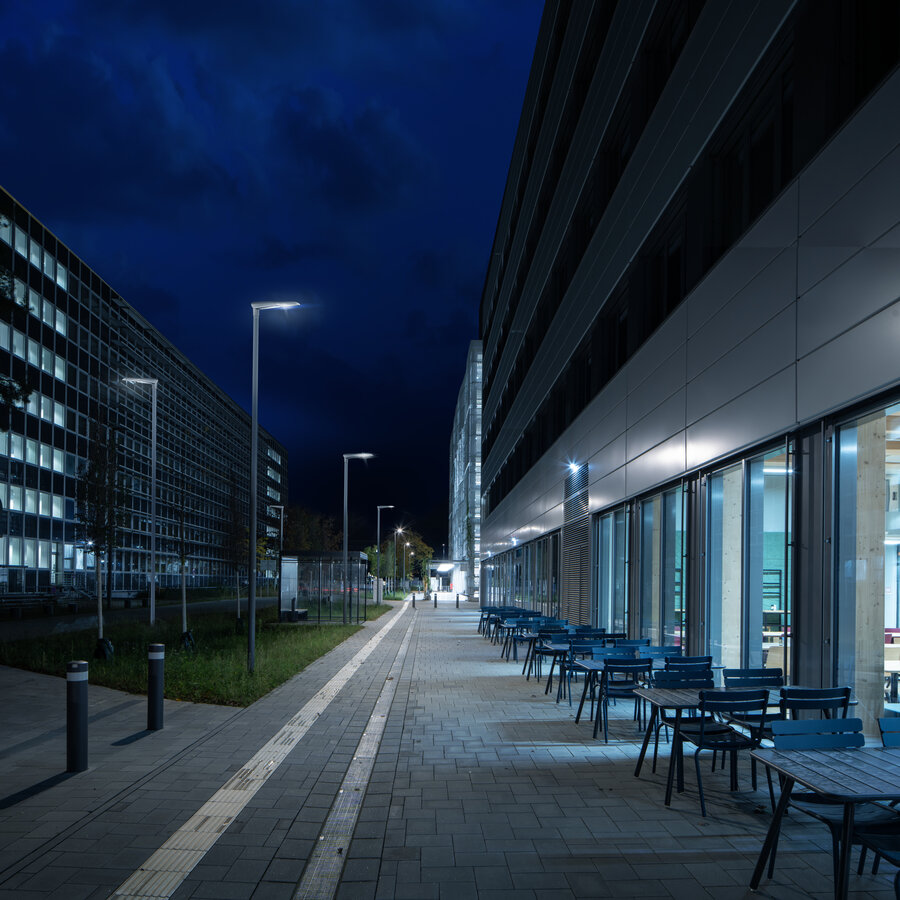 SL 11 iQ sorgt für ein stimmiges Erscheinungsbild und bietet zudem eine klare Orientierung. Wege, Plätze und Erschließungsbereiche sind gleichmäßig ausgeleuchtet, sodass sich Mitarbeiter und Besucher jederzeit sicher fühlen.