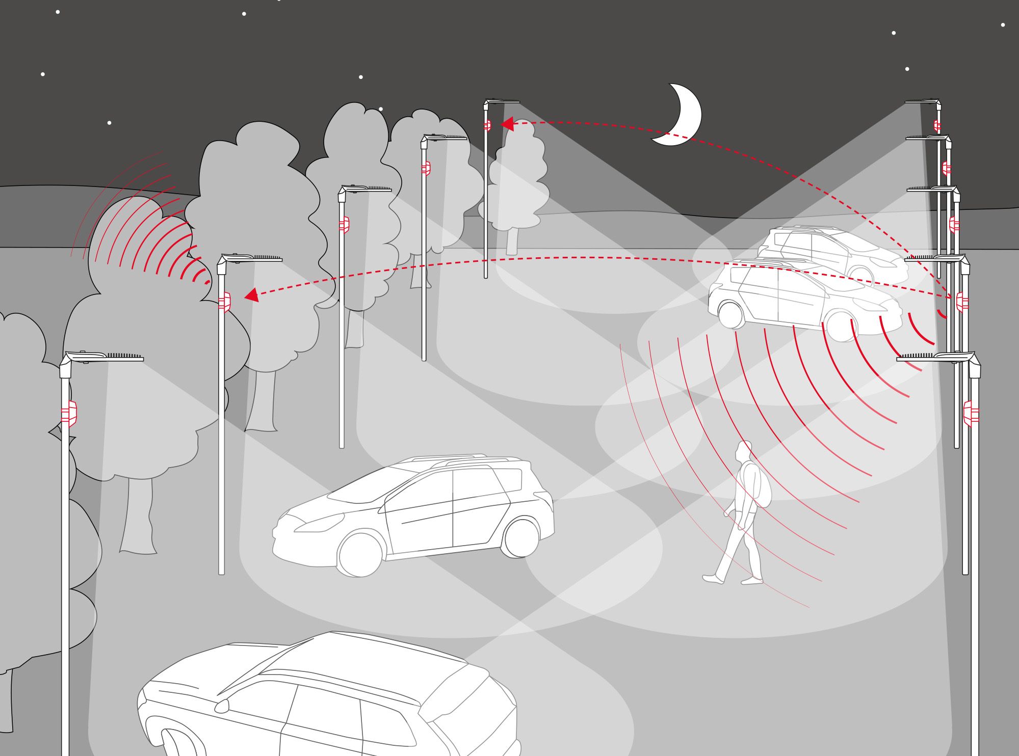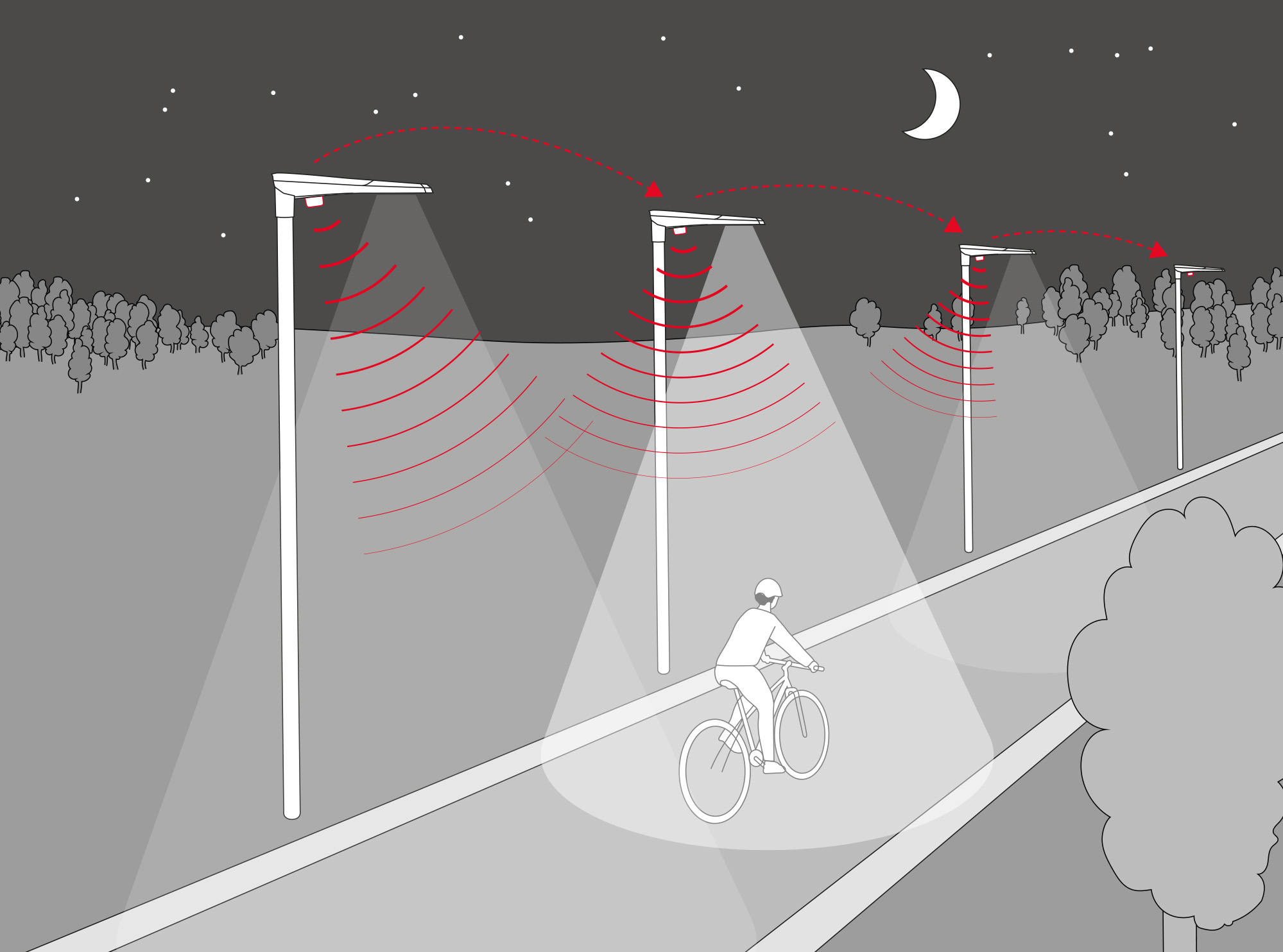 Überlandwege, Parks und Parkplätze? Nach der Dämmerung automatisch dimmen. Und Verkehrssicherheit bewahren durch Bewegungsmelder.