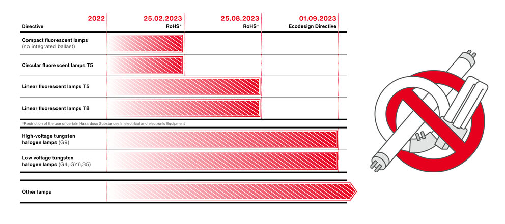 Förbudet gäller att sätta nya produkter på marknaden. Kompaktlysrör och T5- och T8-lysrören började fasas ut under 2023. Nu gäller det att se detta som en möjlighet: På grund av ökade energipriser och tack vare möjlighet till finansiering, är det mer lönsamt än tidigare att renovera belysningen.