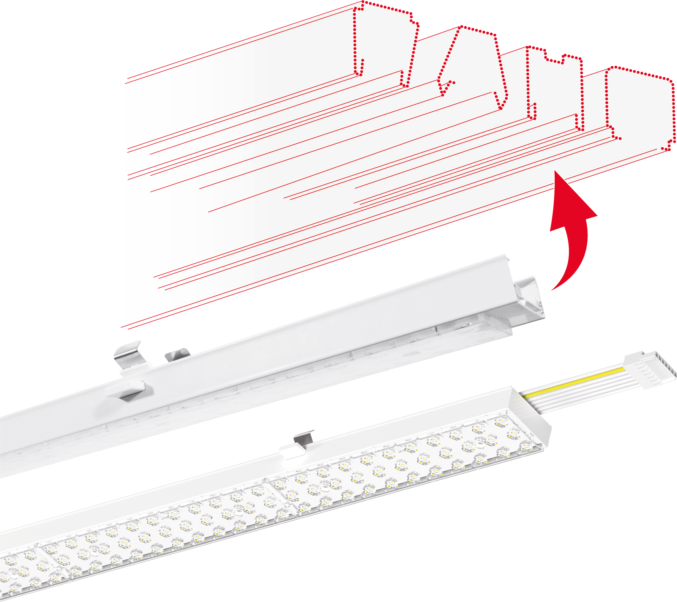 Die große Auswahl an Lichtverteilungen ermöglicht eine einfache Sanierung von Lichtbandsystemen unterschiedlichster Anwendungsbereiche. Multilumenfunktion bei AN / AUS-Typen bietet die Basis für eine bedarfsgerechte Beleuchtungslösung.