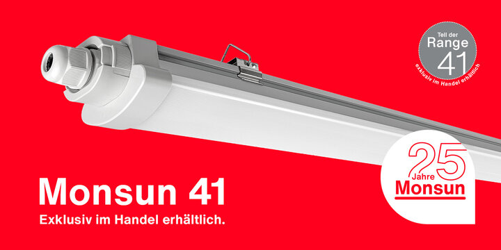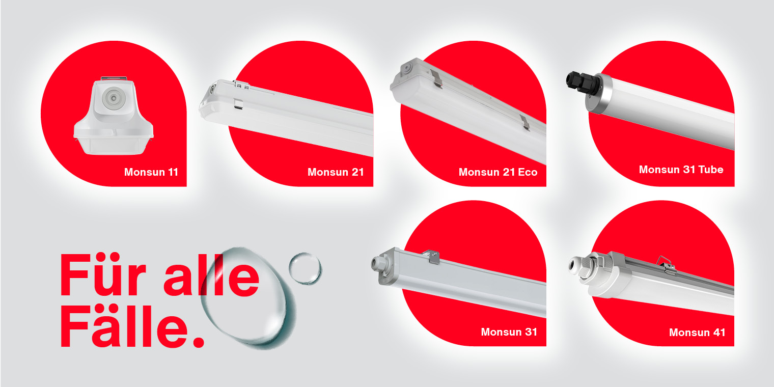 Eine ganze Reihe unterschiedlicher Feucht­raum­leuchten für vielfältige Einsatzzwecke. Sie halten aggressiven Stoffen, Hochdruckreinigern oder heißen und kalten Temperaturen stand. Genau wie die erste Monsun stehen alle für Zuverlässigkeit und Praktikabilität.