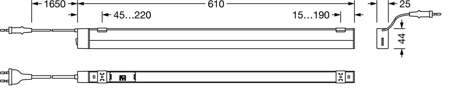 Batten 41-N, Lichtleiste, primäre lichttechn. Abdeckung: Abdeckung, aus PC, satiniert, Lichtaustritt: direkt strahlend, primäre Lichtcharakteristik: symmetrisch, Montageart: Anbau, LED, Bemessungslichtstrom: 1.000lm, Lichtausbeute: 120lm/W, Lichtfarbe: 830/840/850, Farbtemperatur: 3000/4000/5000K, Vorschaltgerät: EIN/AUS, mit Leitung mit Stecker, Netzanschluss: 220..240V, AC, 50/60Hz, Bemessungsleistung: 8,3W, Gehäuse, aus Aluminium, silber, Länge: 610mm, Breite: 25mm, Höhe: 44mm, Stirnwand, aus PC, weiß, Schutzart (gesamt): IP20, Schutzklasse (gesamt): SK II (Schutzisoliert), Prüfzeichen: CE, zul. Betriebsumgebungstemperatur: -20..+40°C, Verpackungseinheit: 1 Stück