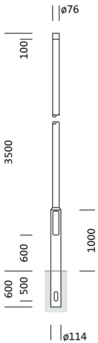 Mast, Mast, zylindrisch abgesetzt, aus Stahl, pulverbeschichtet, SITECO eisenglimmer (DB 702S), Höhe: 3,5m, Zopfmaß: 76mm (Aufsatz), Erdstück: h= 600mm / Ø= 114mm, Norm: DIN EN 40, Verpackungseinheit: 1 Stück