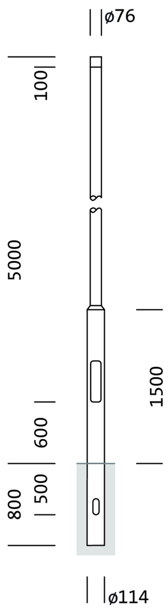 Mast, Mast, zylindrisch abgesetzt, aus Stahl, verzinkt, Höhe: 5,0m, Zopfmaß: 76mm (Aufsatz), Erdstück: h= 800mm / Ø= 114mm, Norm: DIN EN 40, Verpackungseinheit: 1 Stück