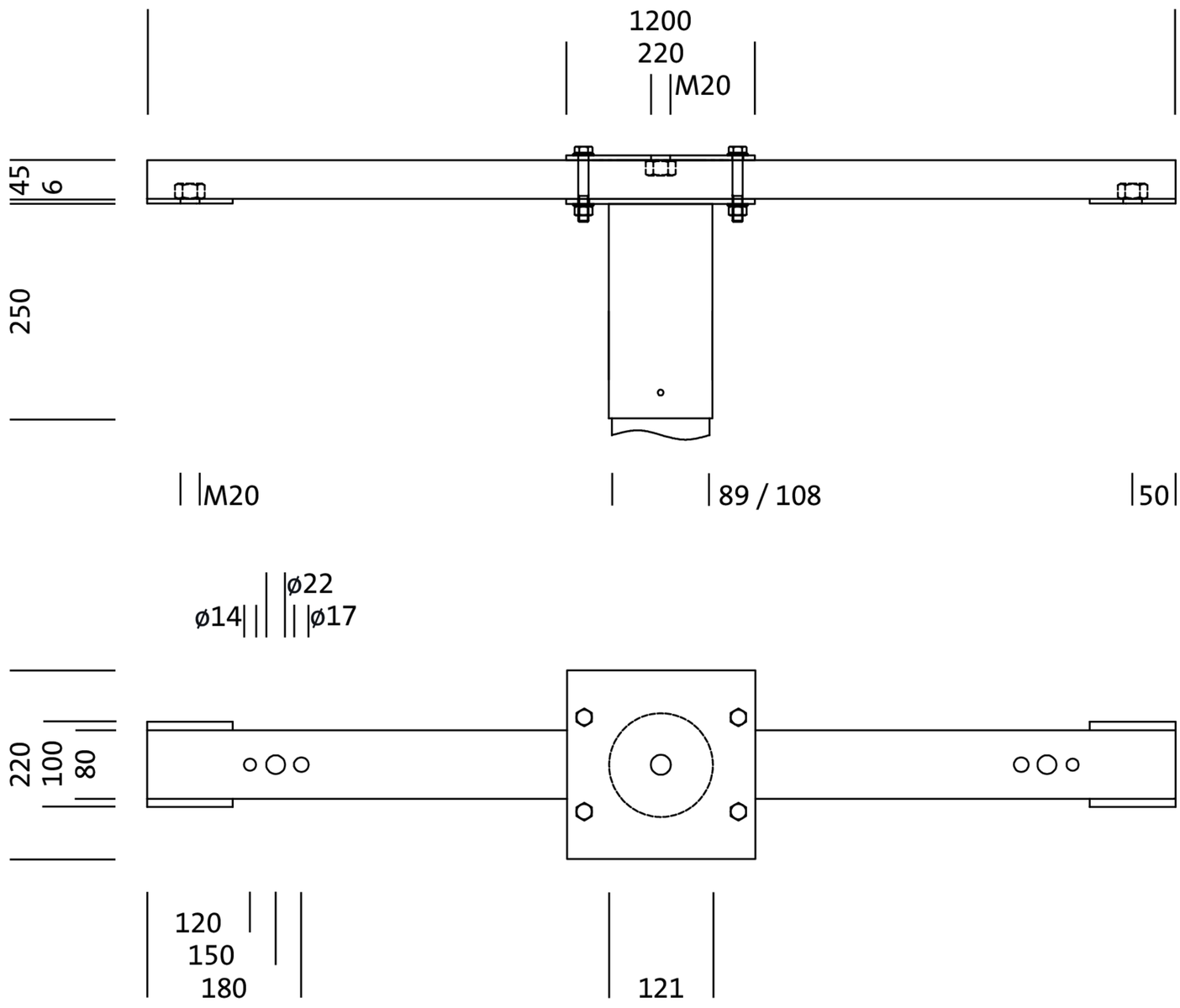 Floodlight FL 11, Floodlight FL 21 midi Baugruppe Montage; Baugruppe Montage mit 1x Traverse für 2 oder 4 Fluter aus Stahl, verzinkt, Typ 1: Aufsatz, Länge: 1.200mm / Zopfmaß: 89..108mm, industry, public (AL), stadion, sports, traffic, Verpackungseinheit: 1 Stück