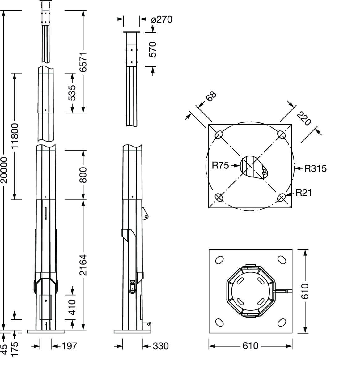 Mast, Kippmast, Montageart: Schraubbefestigung, Kippmast, aus Stahl, verzinkt, für bis zu 4 Stk. Floodlight FL 11 maxi pro in Windzone 1, für bis zu 3 Stk. Floodlight FL 11 maxi pro in Windzone 2, Höhe: 20m, Masttüre, aus Stahl, verzinkt, Breite: 170mm, Höhe: 350mm, Norm: DIN EN 40, Verpackungseinheit: 1 Stück