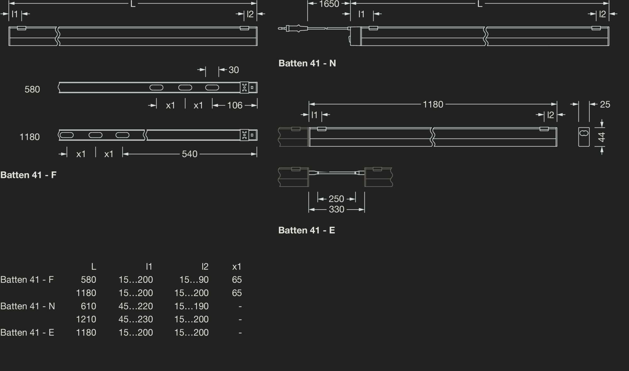 - je Lichtband ist eine 'Batten 41-N' (mit Netzstecker) oder eine 'Batten 41-F' (für Festanschluss) und die gewünschte Anzahl 'Batten 41-E' (Erweiterungsleuchte) erforderlich; (je Lichtband sind max. 15 Leuchten zulässig)