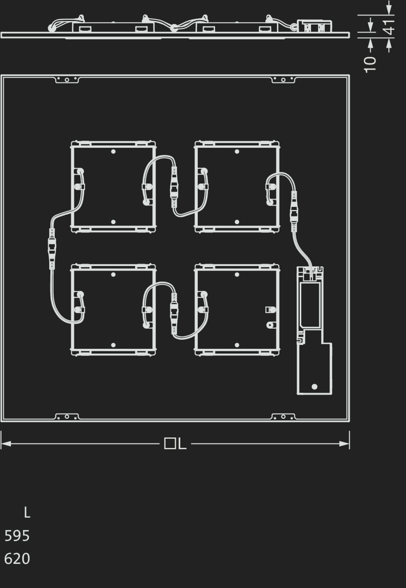 | 4000K | CRI > 80 | 4620lm | 27,6W | 167lm/W | DALI 2, Multilumen | 595x595 | 3,1 | 216,10 |
