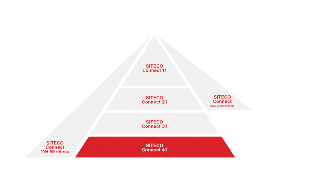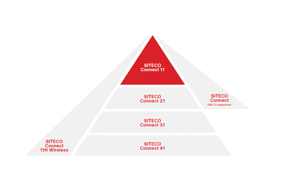 SITECO Connect 11 steuert die Beleuchtung bedarfsgerecht per Sensor, erlaubt flexible Gruppen und Szenen, prüft Einzelbatterie-Notleuchten, bietet zentrales Monitoring und Analyse und lässt sich über standardisierte Schnittstellen nahtlos in Gebäudemanagementsysteme einbinden.