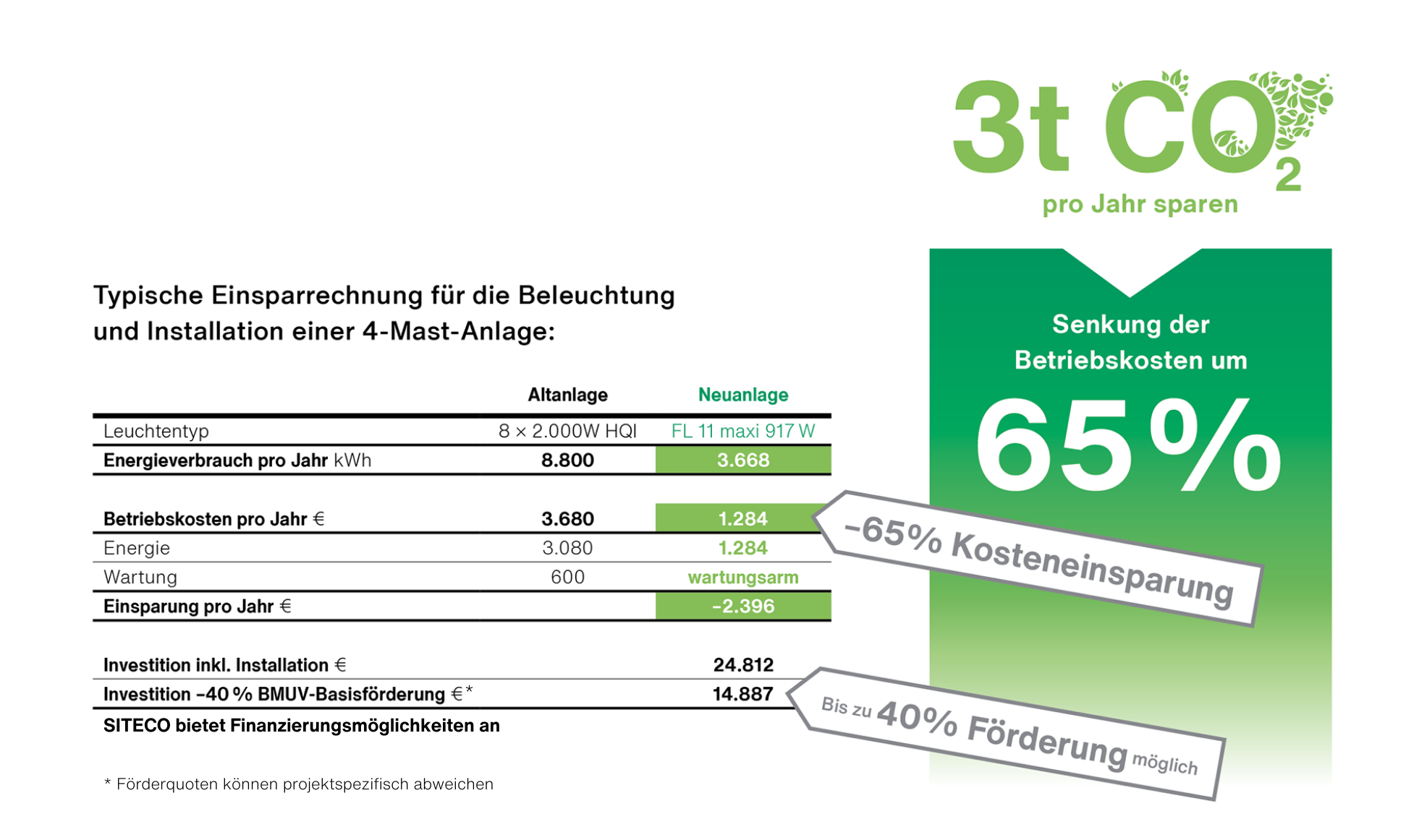 Natürlich ist bei einer Umstellung des Flutlichts auf effiziente LED-Technik mit einem Anfangsinvest zu rechnen. Durch eine Kombination verschiedener Maßnahmen – zum Beispiel durch die Nutzung der vorhandenen Infrastruktur, Fördergelder und Finanzierungsmodelle – wird dieser aber möglichst gering gehalten. Insbesondere die aktuelle Förderquote von bis zu 40 Prozent des Bundesumweltministeriums (BMUV) macht eine neue Flutlichtanlage zu einem lukrativen Investment.