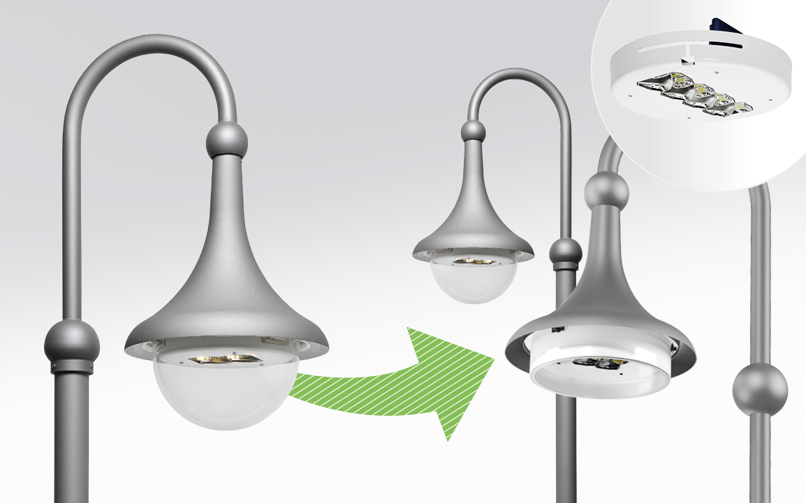 - Einfache Sanierung vorhandener Leuchten mit maximalem Materialerhalt – 90% der Altleuchte bleiben erhalten