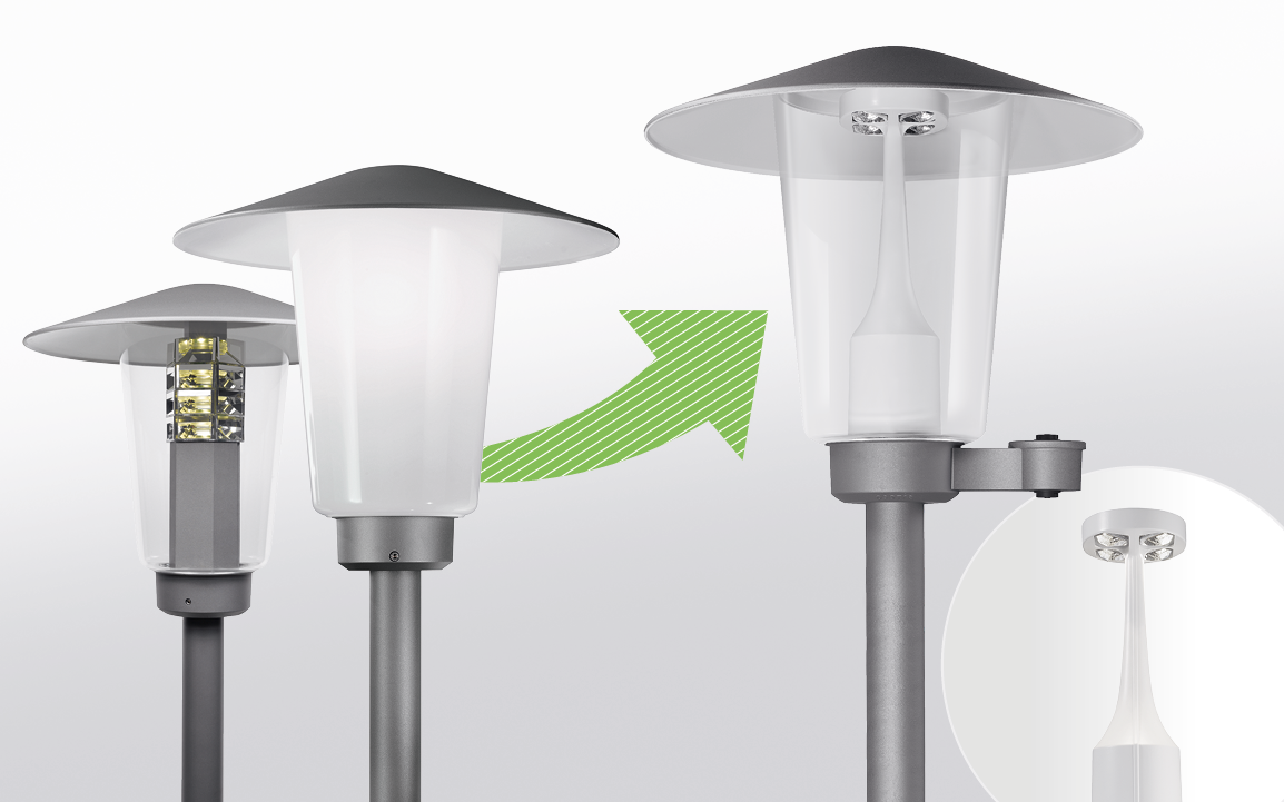 Bestand upgraden durch einfachen Komponententausch. Unter Weiterverwendung des bestehenden Leuchtengehäuses.