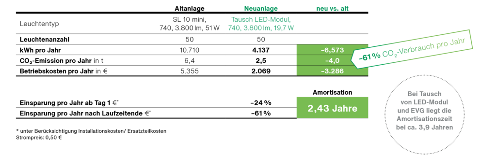 Berechnungsbeispiel bei Tausch des LED-Moduls. Anlage mit SL 10 mini.